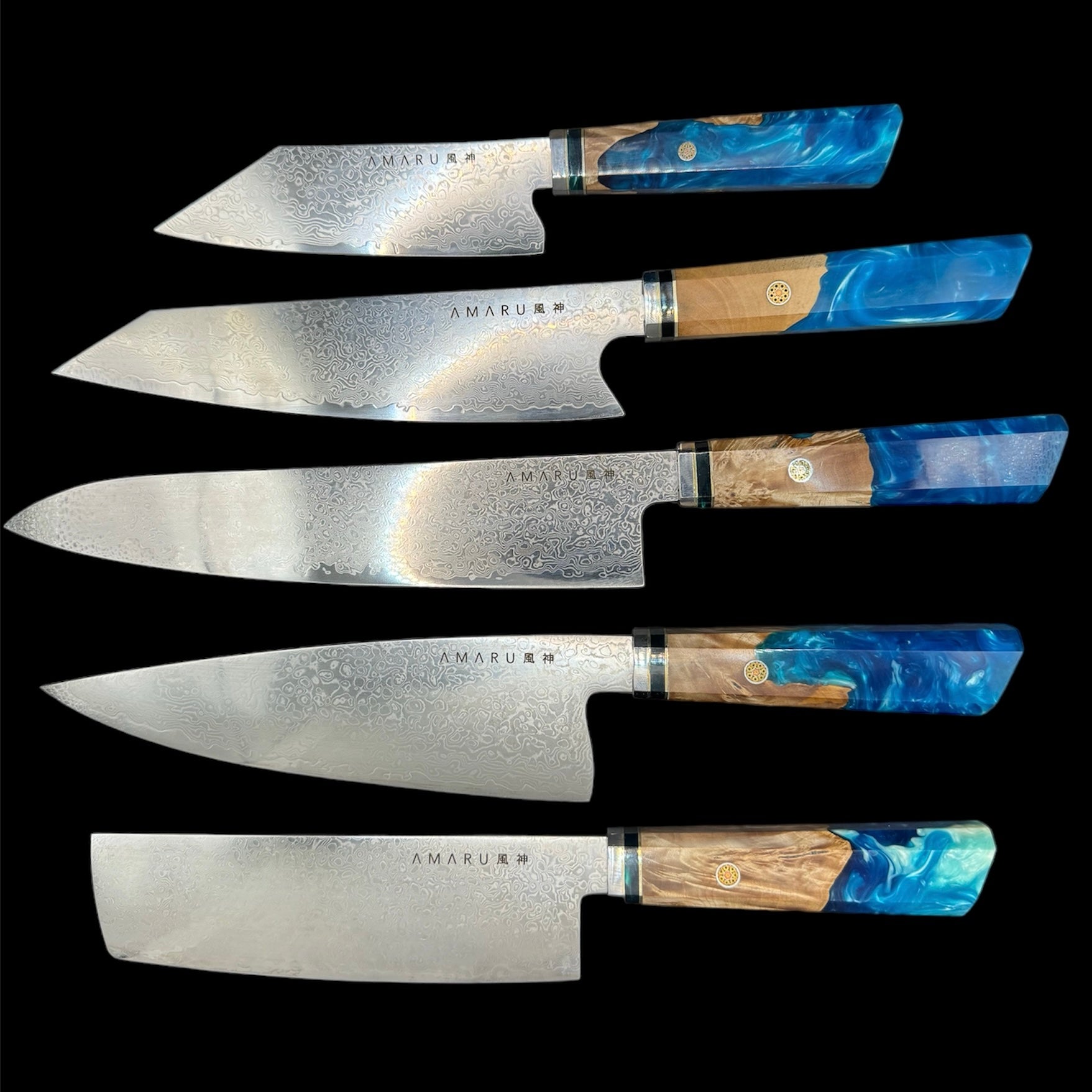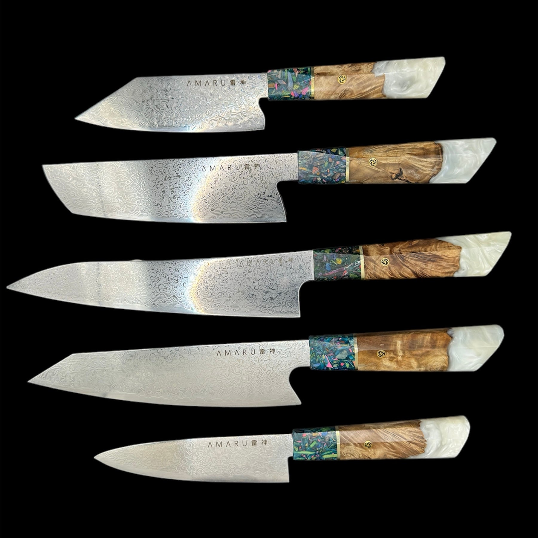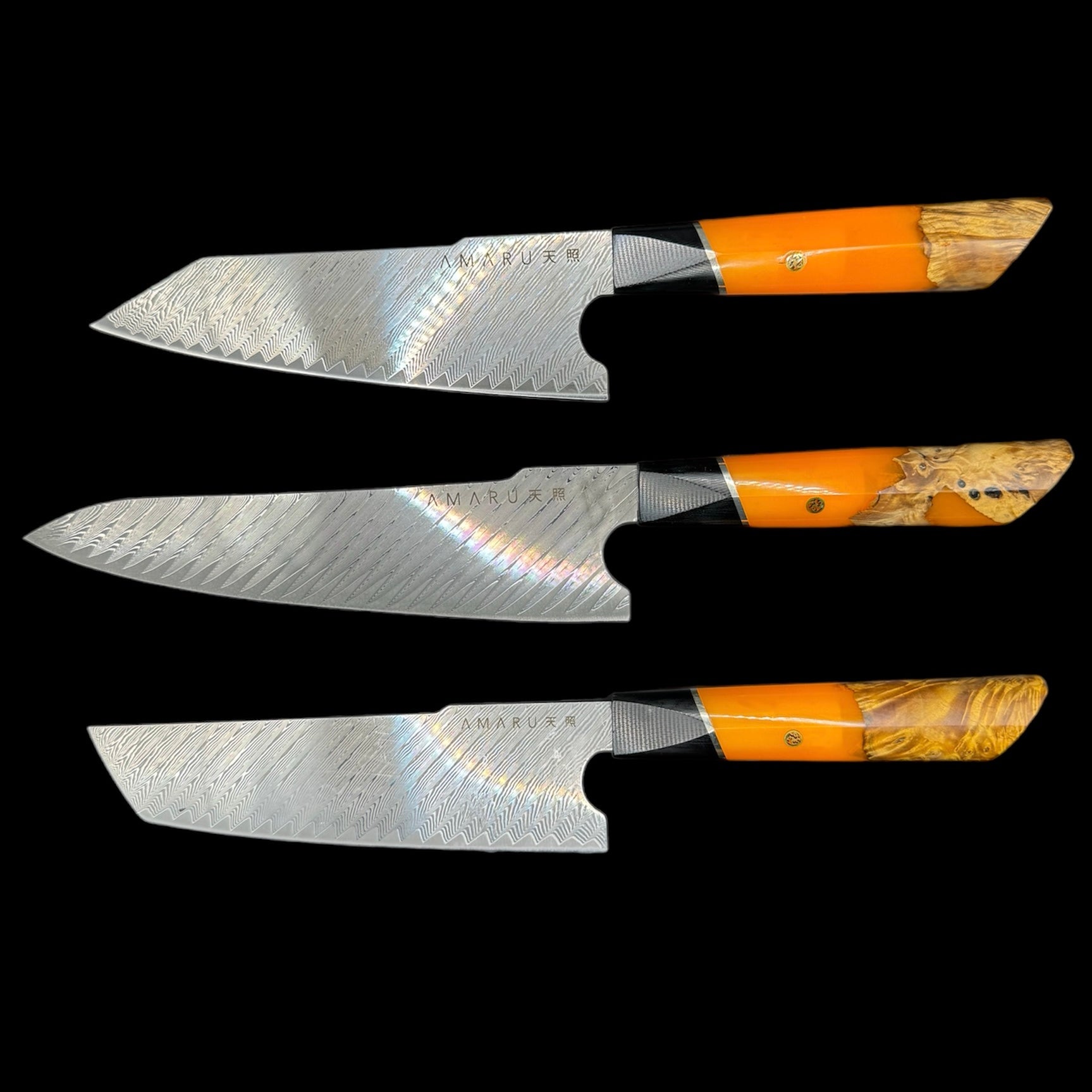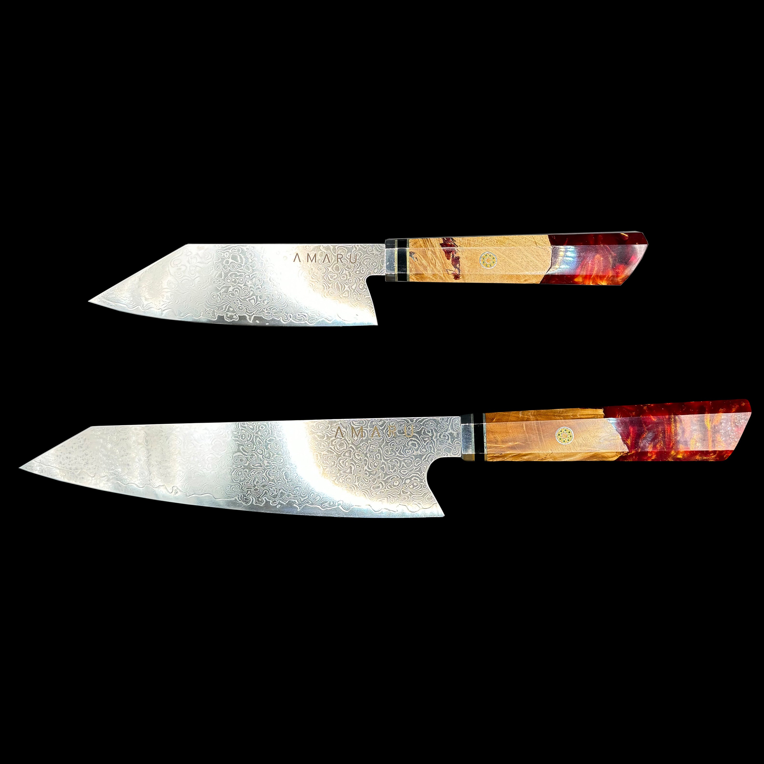 Light meets elegance in Amaterasu — handcrafted birch and resin handles paired with 67-layer Damascus steel make every piece unique and radiant.